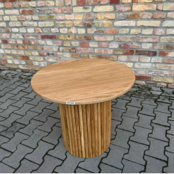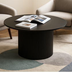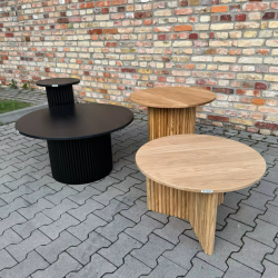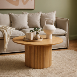 Drewniany stolik kawowy, okrągły stolik z ryflowaną podstawą, styl modern, polski design.