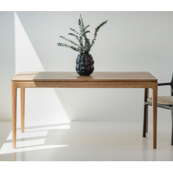 Filo to minimalistyczny stół z litego drewna dębowego, będący hołdem dla rzemiosła i dbałości o każdy detal. Jego projekt łączy harmonijne proporcje, wygodę użytkowania oraz subtelną elegancję łagodnych linii i miękkich konturów. Delikatnie zaokrąglone narożniki, profilowane nogi i starannie wykończone krawędzie tworzą spójną, organiczną całość, która doskonale wpisuje się w stylistykę japandi, modern retro oraz nowoczesnych wnętrz o stonowanej estetyce.